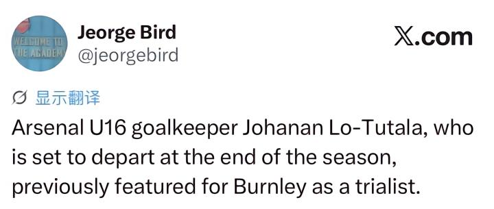 扫描下载懂球帝首页>动态> 懂球号> 赛季末离队,阿森纳16岁2米法国门将前往伯恩利试训