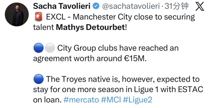记者:曼城接近签下特鲁瓦18岁前锋德图尔贝