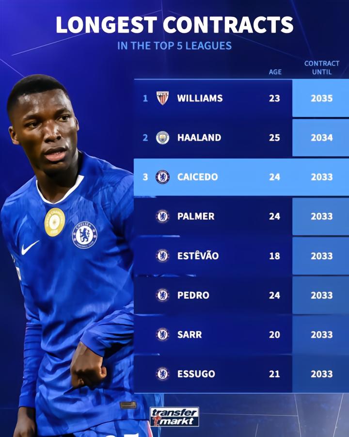 扫描下载懂球帝首页>动态> 五大联赛最长合同榜:尼科-威廉斯、哈兰德前2,切尔西6人上榜