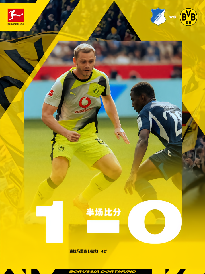 04-18 21:31半场:霍芬海姆1-0多特,克拉马里奇点射破门,聚勒送点+伤退