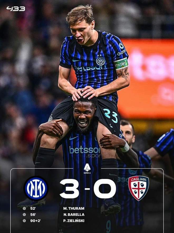 今天凌晨,国米在意甲第33轮主场迎来卡利亚里的挑战,最终凭借下半场小图拉姆、巴雷拉和泽林斯基连进三球,国米3:0轻取对手!