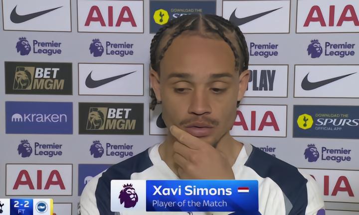 在主场2-2战平布莱顿的赛后,本场比赛传射建功的热刺中场哈维-西蒙斯接受了天空体育的采访。