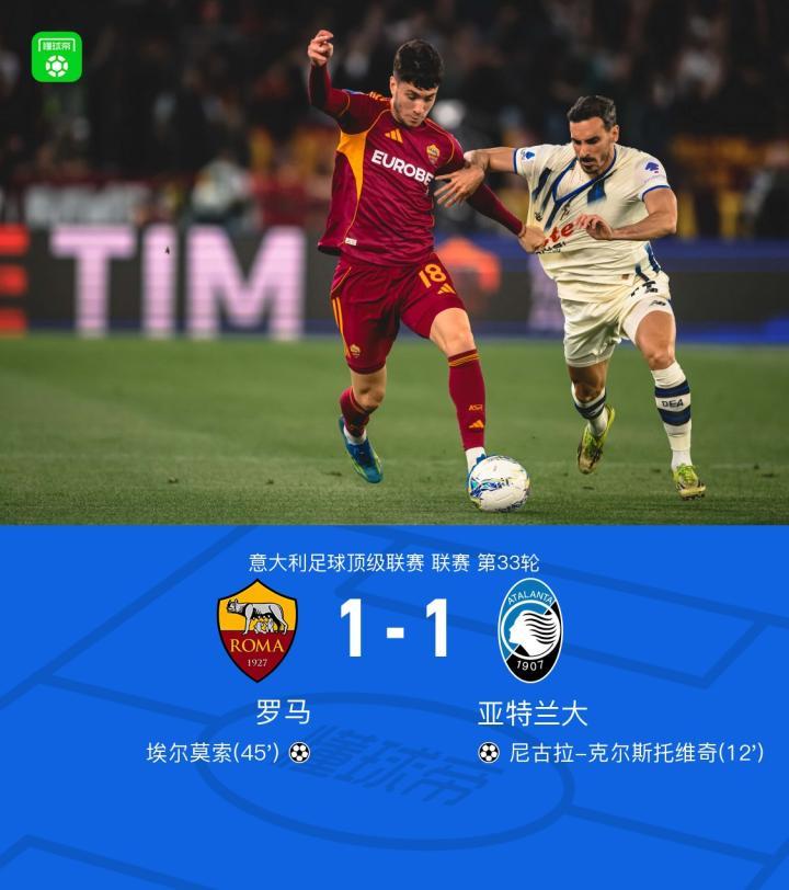 04-19 02:46半场:罗马1-1亚特兰大,克尔斯托维奇破僵,埃尔莫索扳平