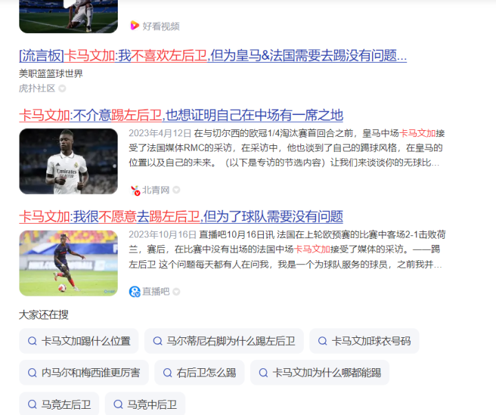 大家也可以看一下过往的新闻,他是怎么说的。其实卡马文加内心并不是很愿意踢左后卫,只是看到球队伤病太多,没办法他才去客串,这与他本意相差甚远。