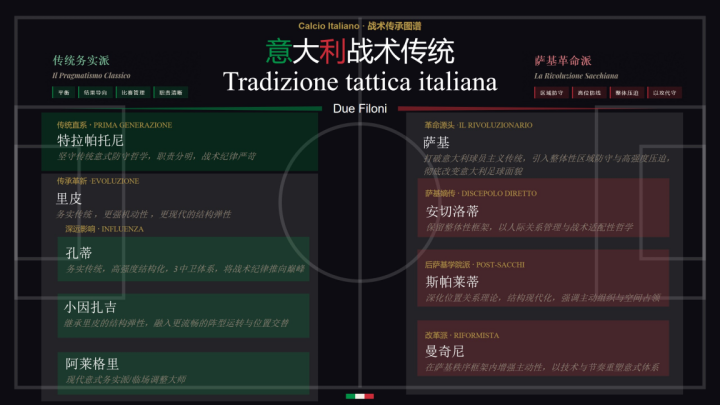 意大利的战术传承则主要分为两条主线:传统的务实派和萨基开创的革命派。这其中有很多熟悉的世界名帅都或多或少受到两大派系的影响。下面着重介绍现在还在任的足球教练风格。