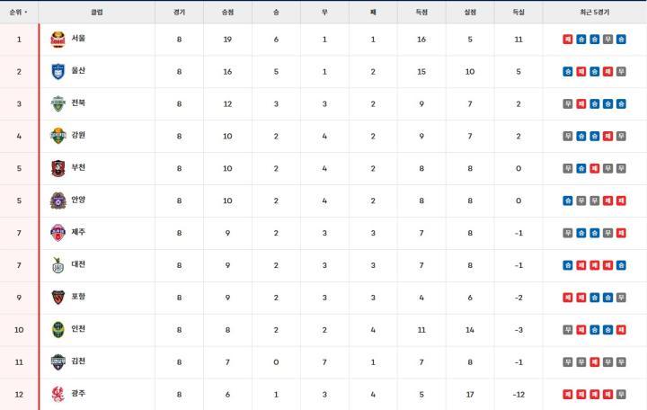 积分榜上,FC首尔、蔚山HD FC已经拉开了全北的积分差距,分列前两位。大田取胜后,已经摆脱倒数第二位,浦项、仁川、金泉尚武和光州分列倒数后四位。下周中,K1联赛将进行双赛轮,也许积分榜还会有起伏。