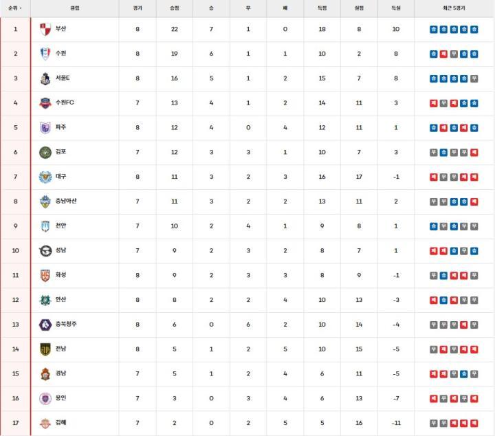 本轮战罢,釜山IPark、水原三星蓝翼、首尔衣恋位居前三位,凭借金浦、大邱和水原FC三支球队的失手,坡州开拓者已经爬到第五位,距离水原FC也只有1分差距。而随着金海拿到本赛季第二分,他们与本轮轮空的龙仁FC只有1分差距,对于两队来说,他们的首胜何时到来呢?而下周釜山和水原三星的榜首大战,则更加令人期待!