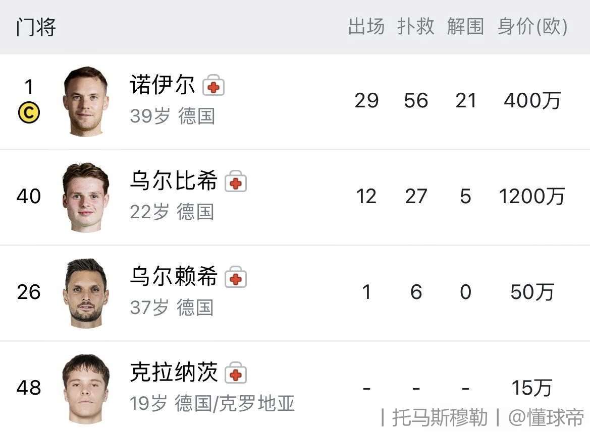 门将伤了咋的?拜仁打亚特兰大以后,一门二门都伤了,然后打药厂三门也伤了,再然后二门轻微脑震荡付出了(只参与了最后一天训练,正常应该休养10天小小乌8天付出了),不然就是替补席的16岁小孩上了,因为拜仁二队的19岁主力门将也伤了。换句话说,打完药厂以后,拜仁的训练场,只有一个16岁的小门将了,不比你惨?别找借口了,这赛季踢完你就该滚蛋
