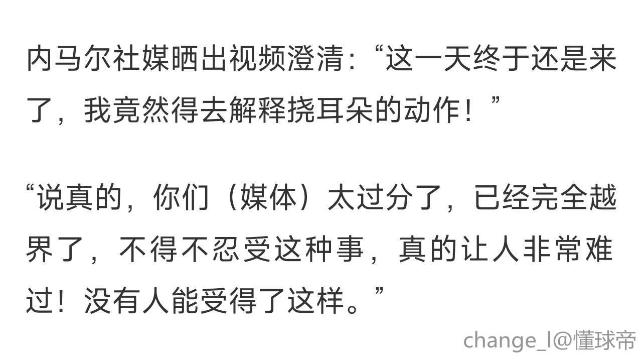 赛后,内马尔在社交媒体上表达了自己的感受:“到了我必须‘敲敲警钟’的时候了!没想到有一天我还得专门发文解释我这个动作(手指堵住耳朵),其实我没针对任何人。大家(媒体)说真的,你们真的有点过分了,已经超越了底线……不得不面对这种情况真的太令人心痛了!没有人能够承受得了这种事。”