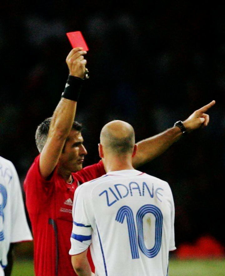 当值主裁判(阿根廷人埃利松多)经过第四官员梅迪纳-坎塔莱霍的提醒,将齐达内红牌罚下。