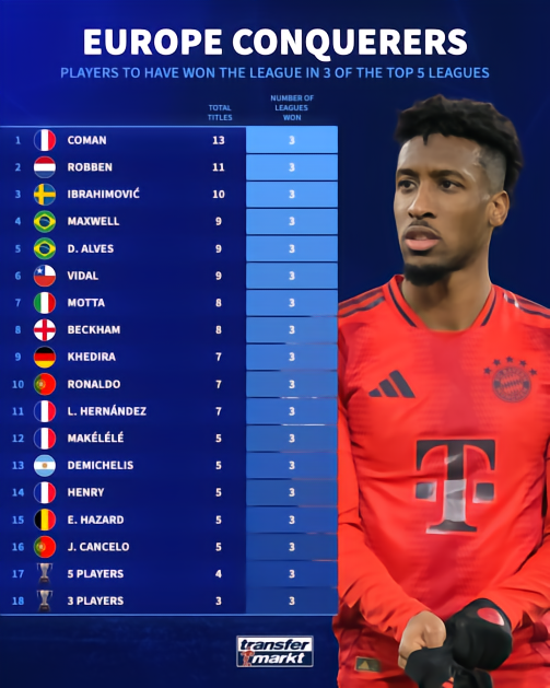 这个记录科曼是最可惜的,以他的年龄和冠军数,在这个记录上本有希望一骑绝尘
