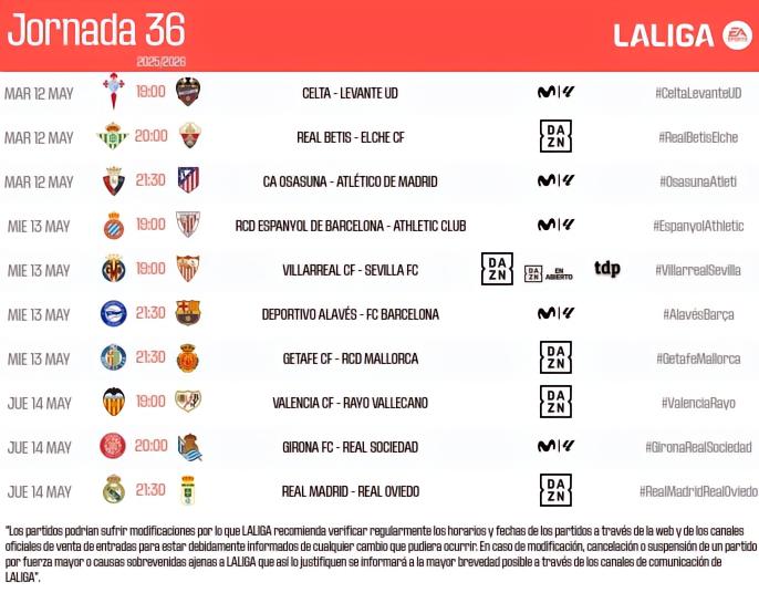扫描下载懂球帝首页>动态> 西甲第36轮开球时间:巴萨、皇马比赛凌晨3:30开打