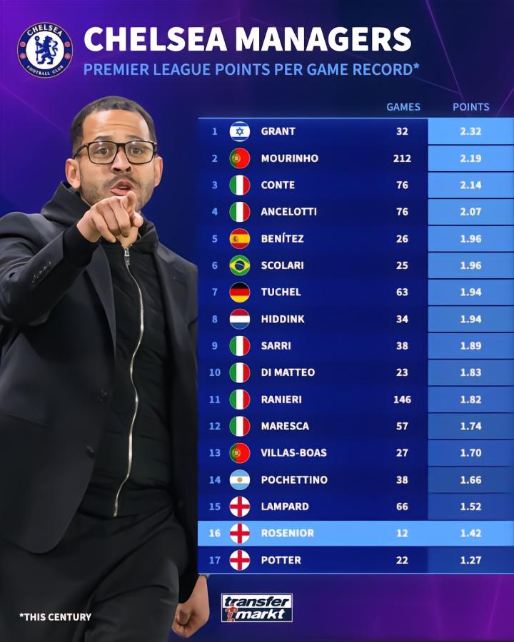 扫描下载懂球帝首页>动态> 1.42分,罗塞尼尔是本世纪英超场均积分第二低的切尔西主帅