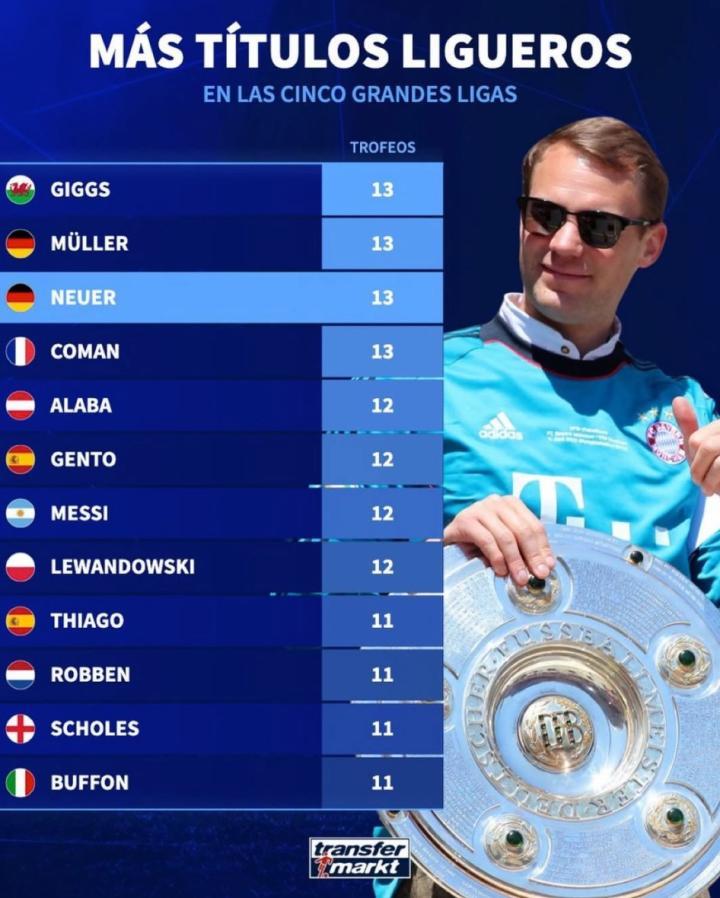 扫描下载懂球帝首页>动态> 五大联赛球员夺冠榜:诺伊尔13次第1,追平吉格斯、穆勒、科曼