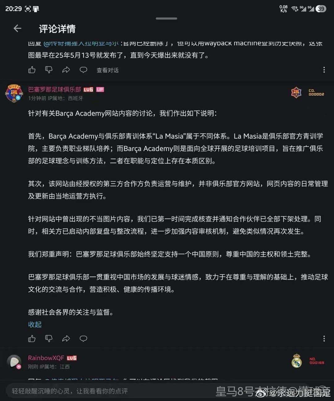 皇马好歹微博B站专门发了一条帖子回应,不是我洗皇马,皇马没有全网道歉确实cs招黑,但巴萨这操作和皇马有什么区别吗?甚至还是评论区特供