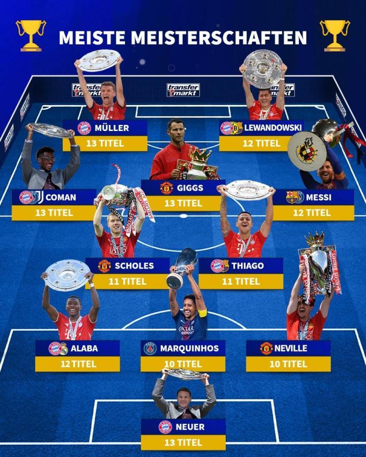 五大联赛球员夺冠榜:诺伊尔13次第1,追平吉格斯、穆勒、科曼
