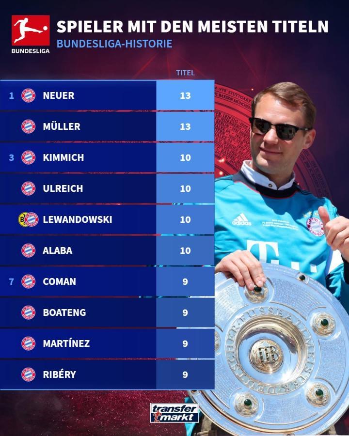 扫描下载懂球帝首页>动态> 懂球号> 德甲冠军排行榜:诺伊尔追平穆勒并列第一,基米希未...