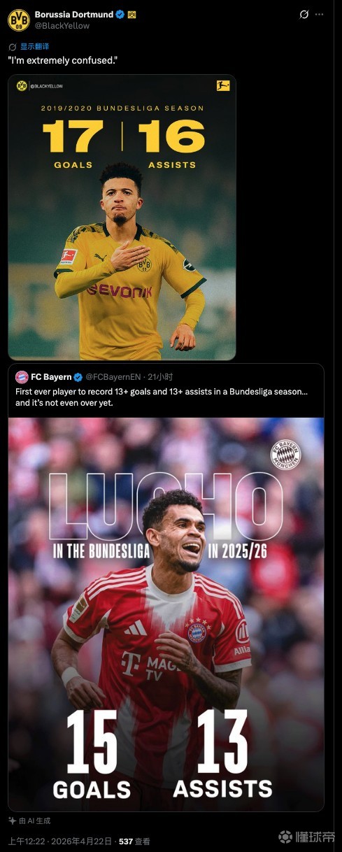 扫描下载懂球帝首页>动态> 拜仁官方“吹”路易斯-迪亚斯表现,多特官方用桑乔数据指正
