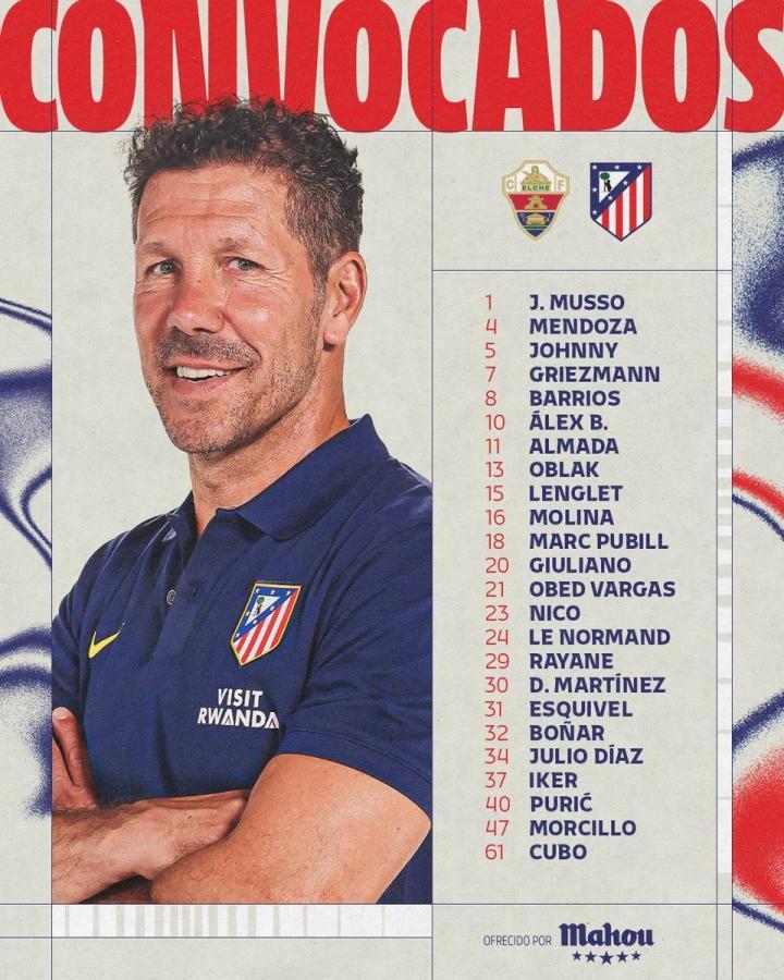 扫描下载懂球帝首页>动态> 马竞客战埃尔切大名单:小蜘蛛等8人缺阵,西蒙尼征召二队9人