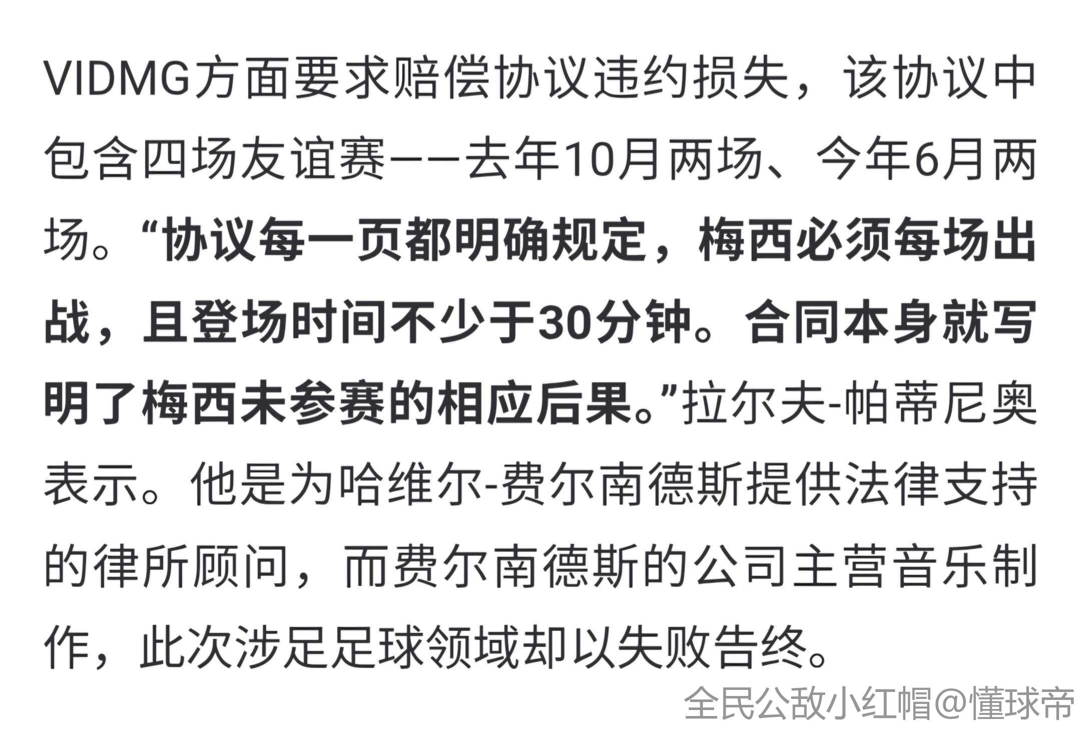 VIDMG方面要求赔偿协议违约损失,该协议中包含四场友谊赛——去年10月两场、今年6月两场。“协议中的每一页都明确规定,梅西每场比赛都要出战,并且他登场的时间不能少于30分钟。合同中本身就写明了梅西没有参赛的相应后果。”拉尔夫-帕蒂尼奥表示。帕蒂尼奥是为哈维尔-费尔南德斯提供法律支持的律所顾问,而费尔南德斯的公司VIDMG主营音乐制作,此次涉足足球领域却以失败告终。