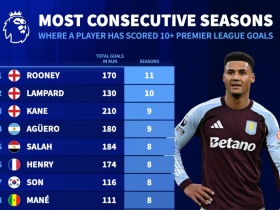 英超连续最多赛季进球数上双球员:鲁尼、兰帕德、凯恩前三