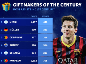 本世纪俱乐部+国家队助攻榜单:梅西446次第1,C罗305次第6