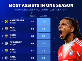本世纪五大联赛球员单赛季助攻前10:姆希塔良第1,奥利塞第7