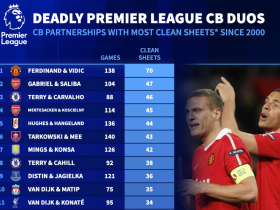 德转统计本世纪英超首发中卫搭档零封榜:费迪南德+维迪奇第1