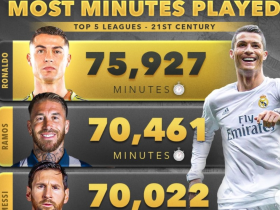 21世纪五大联赛出场时间:C罗居首,拉莫斯第二、梅西第三