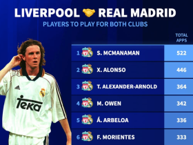 利物浦+皇马出场数排名:麦克马纳曼、阿隆索、阿诺德前3