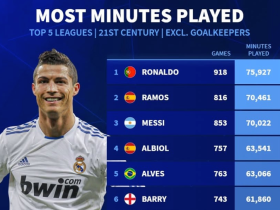21世纪五大联赛外场球员出场时间榜:C罗、拉莫斯、梅西前3