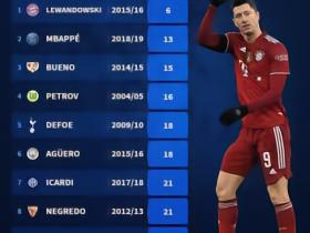 本世纪五大联赛单场大四喜用时榜:莱万居首,姆巴佩C罗在列