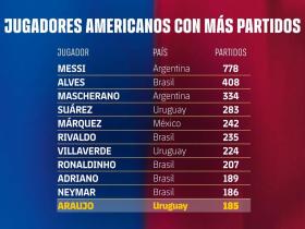 185场,阿劳霍距离跻身巴萨队史拉美球员出场榜前十只差1场