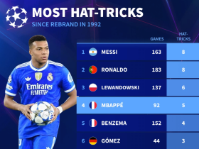 欧冠改制后戴帽榜:梅罗8次居首,姆巴佩3次并列第五