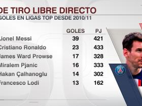 2010-11赛季至今任意球破门榜单:梅西39球居首,C罗23球第二