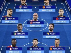 德转列现役自由球员生涯最高身价11人阵容:埃里克森1亿欧领衔
