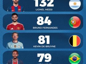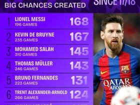 17-18赛季以来创造绝对机会数量:梅西少踢两个半赛季仍领跑
