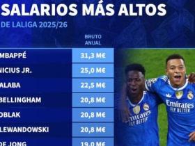 德转列西甲球员年薪榜:姆巴佩3130万欧居首,皇马包揽前四