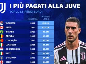 尤文本赛季税前年薪前20:弗拉霍维奇2220万第1,戴维1110万