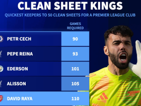 英超俱乐部最快达成50场零封门将前10:切赫第1,拉亚第5
