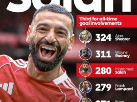 萨拉赫英超生涯已参与280球,超越兰帕德独占历史第三
