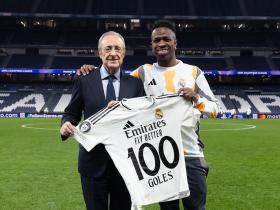 24岁零6个月,维尼修斯是达成皇马百球第三年轻的球员