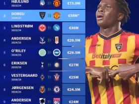 丹麦球员历史转会费榜:霍伊伦居首,多古次席,埃里克森在列