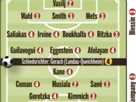 图片报圣保利vs拜仁评分:穆西亚拉2分,格雷茨卡、凯恩4分