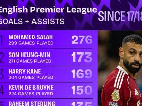17/18赛季以来英超参与进球数榜:萨拉赫第一,孙凯分居二三