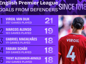17-18赛季至今英超联赛后卫进球榜:范戴克21球第一