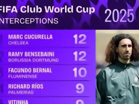 世俱杯拦截次数榜:库库雷利亚12次居首,帕尔梅拉斯三人上榜