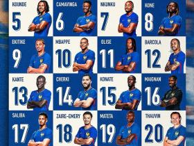 法国队最新球衣号码:恩昆库7号,坎特13号,谢尔基14号