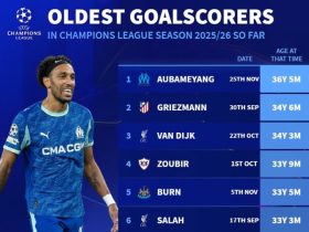 本赛季欧冠最年长进球榜:奥巴梅扬、格列兹曼、范戴克前三