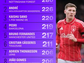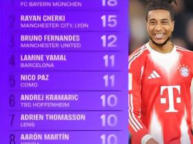 2025年五大联赛助攻榜:奥利塞18次居首,谢尔基15次位列第二